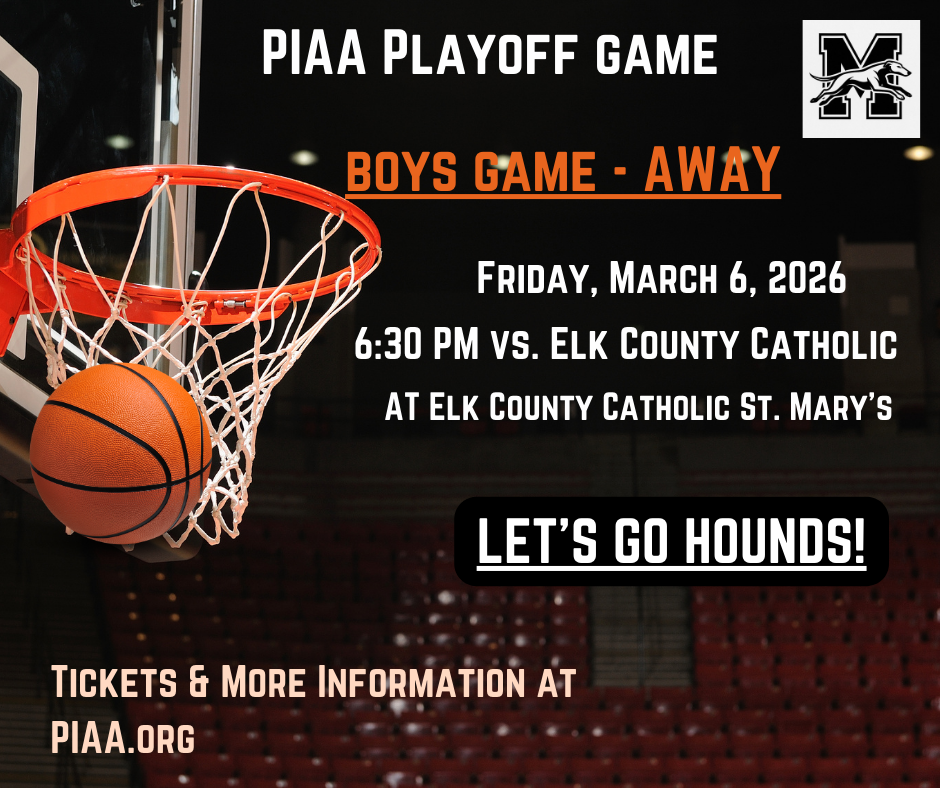 PIAA Playoffs Boys Basketball PIAA Playoff Game Monessen Boys Varsity Basketball PIAA Playoffs vs. Elk's County Catholic Friday, March 6, 2026 6:30 PM @ Elk's County Catholic, St. Mary's Let's Go Hounds!!! Ticket Link: CLICK HERE FOR TICKETS