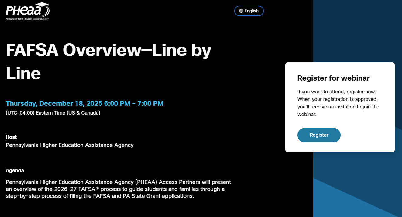 PHEAA Access Partners will present an overview of the 2026-27 FAFSA process to guide students and families through a step-by-step process of filing the FAFSA and PA State Grant applications.